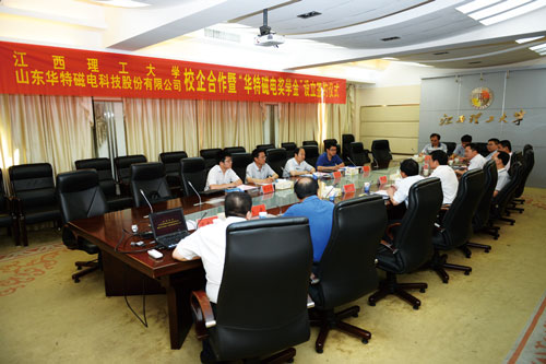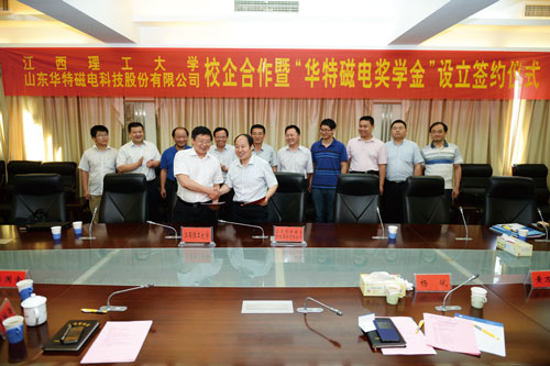 6月30日上午,公司董事長(zhǎng)兼總裁、磁電聯(lián)盟理事長(zhǎng)王兆連、技術(shù)總工程師賈洪利等一行4人到江西理工大學(xué)洽談校企合作事宜,并簽訂校企戰(zhàn)略合作協(xié)議和捐資華特磁電獎(jiǎng)學(xué)基金協(xié)議。江西理工大學(xué)校長(zhǎng)羅嗣海、副校長(zhǎng)溫和瑞、楊斌以及黨辦校辦、研究生院、學(xué)工部、對(duì)外聯(lián)絡(luò)與合作處、科技處、資環(huán)學(xué)院相關(guān)負(fù)責(zé)人出席了簽約儀式。簽約儀式由溫和瑞副校長(zhǎng)主持。