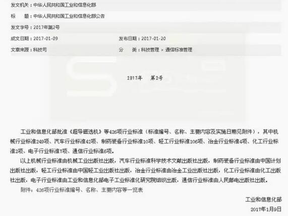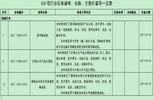 2017年7月1日,由華特磁電主持制定的《JB/T 13013-2017強制油冷卻立環高梯度磁選機》、《JB/T 13008-2017礦物氣流分級機》、參與制定的《JB/T 13002-2017超導磁選機》等3項行業標準由國家工業和信息化部正式頒布實施。截至目前,華特磁電已累計主持制定和參與制定行業標準達16項。