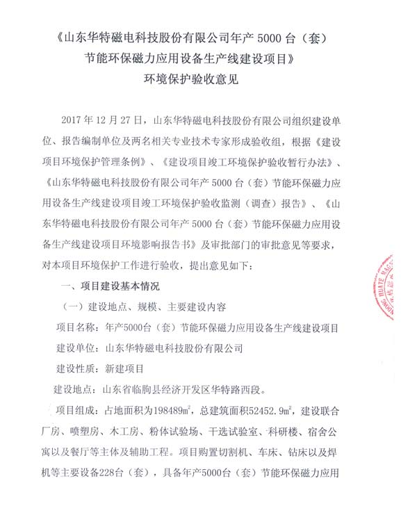 《山東華特磁電科技股份有限公司年產5000臺(套)節能環保磁力應用設備生產線建設項目》環境保護驗收意見公示