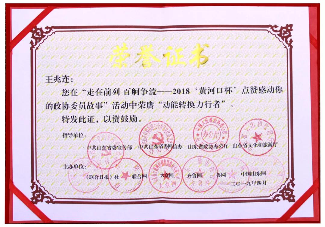 王兆連董事長在“走在前列 百舸爭流——2018‘黃河口杯’點贊感動你的政協(xié)委員故事”活動中榮膺“動能轉換力行者”