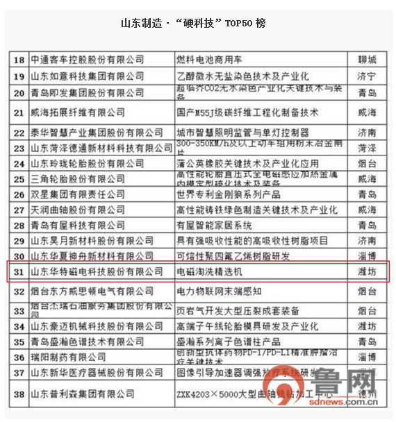 華特公司“電磁淘洗精選機”產品入圍“2019山東制造?硬科技Top50品牌榜”