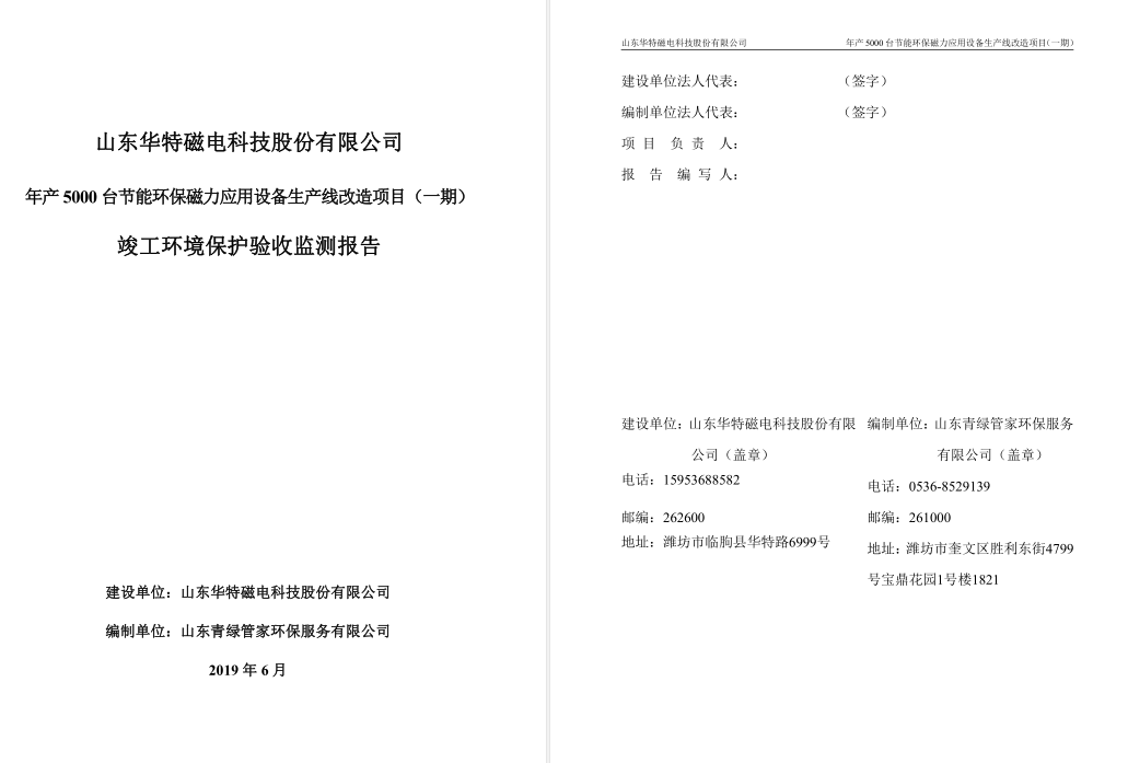 山東華特磁電科技股份有限公司年產(chǎn)5000 臺節(jié)能環(huán)保磁力應(yīng)用設(shè)備生產(chǎn)線改造 項目(一期)竣工環(huán)境保護(hù)驗收監(jiān)測報告