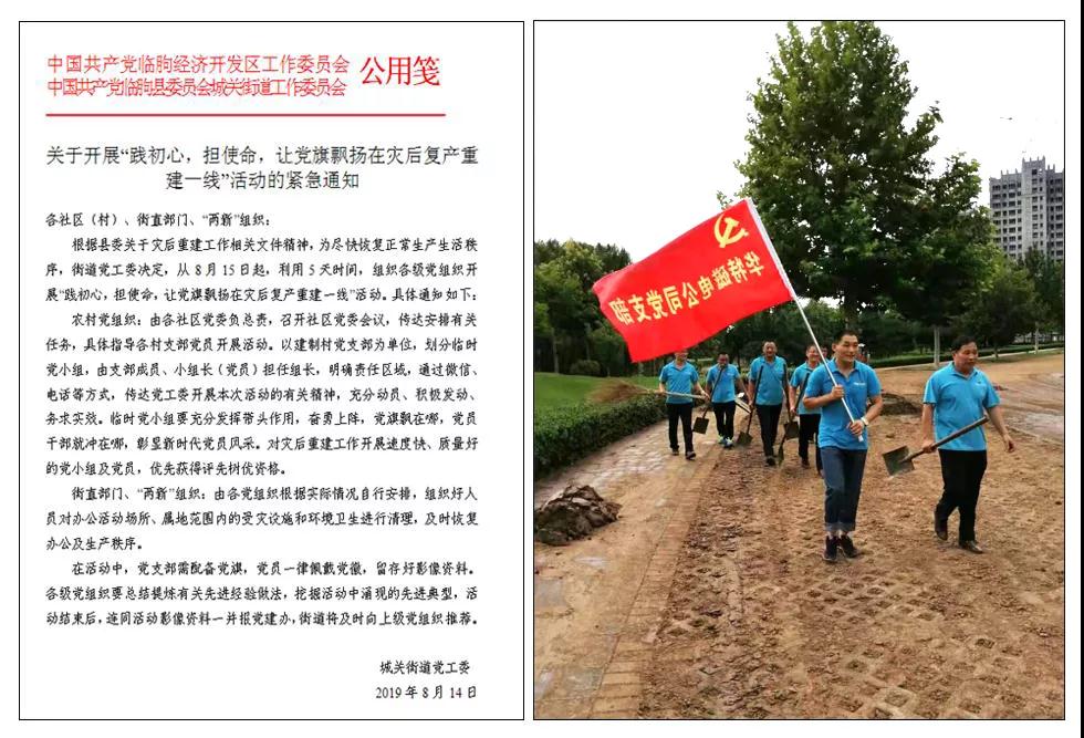 公司黨支部響應(yīng)城關(guān)街道黨工委“關(guān)于開展‘踐初心,擔(dān)使命’讓黨旗飄揚(yáng)在災(zāi)后復(fù)產(chǎn)重建一線”活動(dòng)號召,公司黨支部組織協(xié)調(diào)共青團(tuán)、工會(huì),組織廣大黨員干部迅速行動(dòng)起來,開展了“發(fā)揮黨員先鋒模范作用,打贏災(zāi)后重建攻堅(jiān)戰(zhàn)”活動(dòng),帶領(lǐng)廣大干部員工投入災(zāi)后復(fù)產(chǎn)自救,將災(zāi)后損失降到最低。