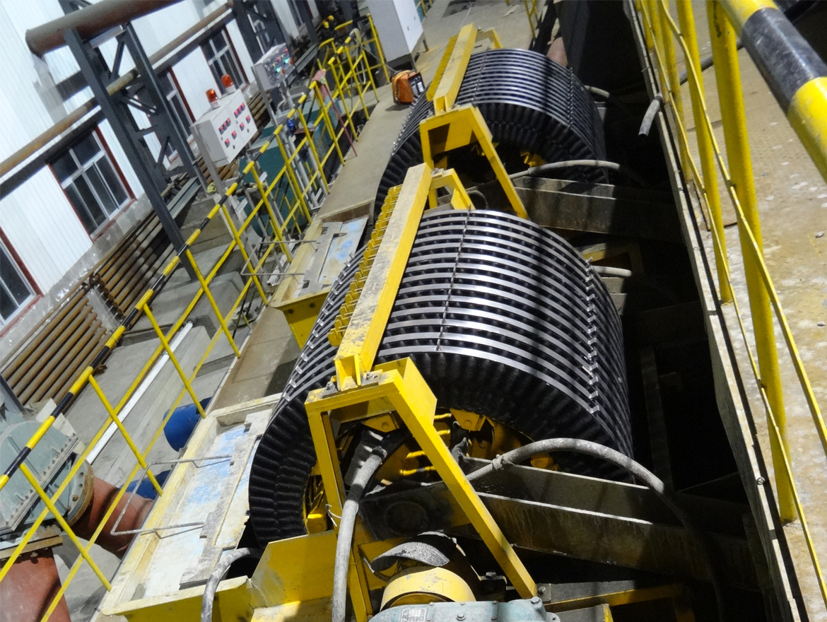 YCW系列無水卸料回收機是我公司根據(jù)國外先進經(jīng)驗研制開發(fā)的一種新型產(chǎn)品。該磁系采用一組由外裸磁塊鑲嵌而成的磁環(huán),按照一定間隙排列而成。該磁系直接作用磁性物料,磁場強度高,作用梯度大,回收率可高達85%-95%,特別是采用V形刮板,借助磁性物料自身重量,實現(xiàn)了無水或少水一次卸料。