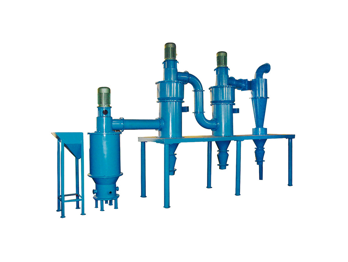 整套分級裝置由氣流分級機、旋風收集器、脈沖除塵器、高壓引風...